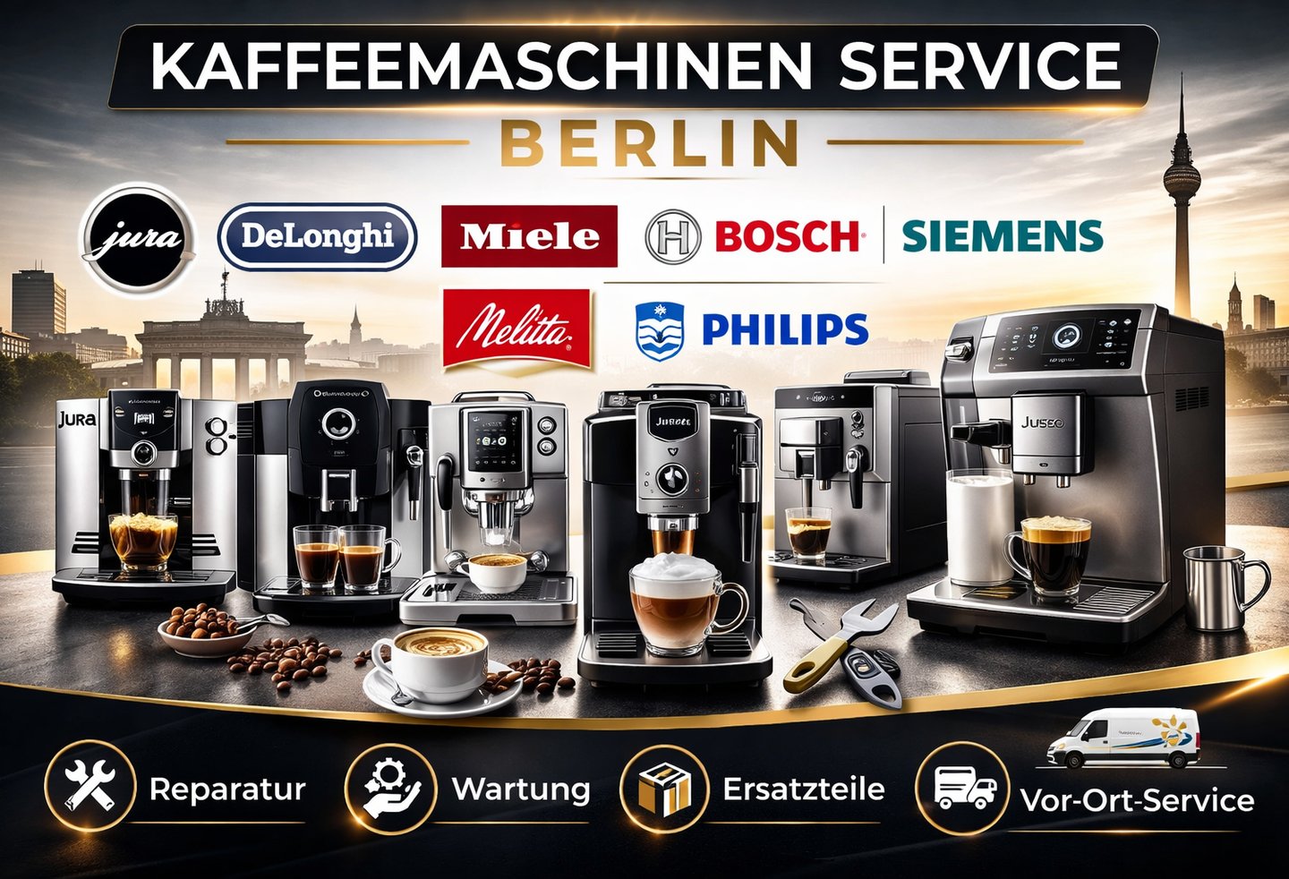 Jura Delonghi Saeco Philips Miele Siemens Bosch Neff Siebträgermaschinen Gastrokaffeemaschinen Kundendienst und Reparaturen in Berlin, zuverlässig und schnell.